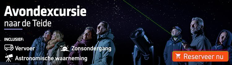 En wat dacht je van de sterrenhemel na zonsondergang? 's Nachts strekt de schoonheid van de sterrenhemel zich boven je uit en zul je betoverd raken door het hemelse spektakel. Om zo veel mogelijk te genieten, raden we je de Avondexcursie naar de Teide en de eerder genoemde Astronomische Tour aan, die de twee voorgaande activiteiten omvat: een bezoek aan het Observatorium en het sterrenkijken.